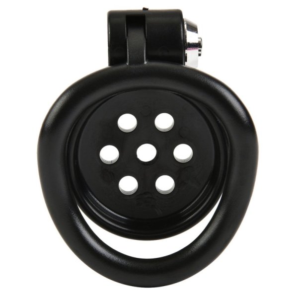 This flat chastity cage is made from high-quality plastic and comes in colors such as pink and black. The design is very unique, with a central hole surrounded by six additional holes, allowing you to attach chains or insert a catheter, adding more fun and control.